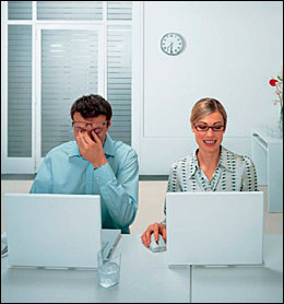 Odbrana od računara Fotofobiju može izazvati i svetlost monitora pa osoba koja koristi kompjuter treba da se pridržava određenih pravila. • Povremeno odvraćati pažnju od ekrana i svaka dva sata praviti pauzu od 10-15 minuta. U većini zemalja ovo je čak predviđeno zakonom za zaposlene koji provode mnogo vremena za računarom. • Podesiti ugao videoterminala: idealno je 10-20 stepeni ispod nivoa očiju radi prirodnog položaja glave. • Ko radi sa grafičkim funkcijama visoke rezolucije treba da koristi veći monitor, na primer od 19 inča. • Zadržati udaljenost od oko 50-70 centimetara (za dalekovide tražiti posebna rešenja). • Izbegavati druge svetlosne izvore u radnoj prostoriji koji bi bacali svetlost na monitor. U tom smislu, pomažu i zavese. • Ne koristiti prejako osvetljenu pozadinu.